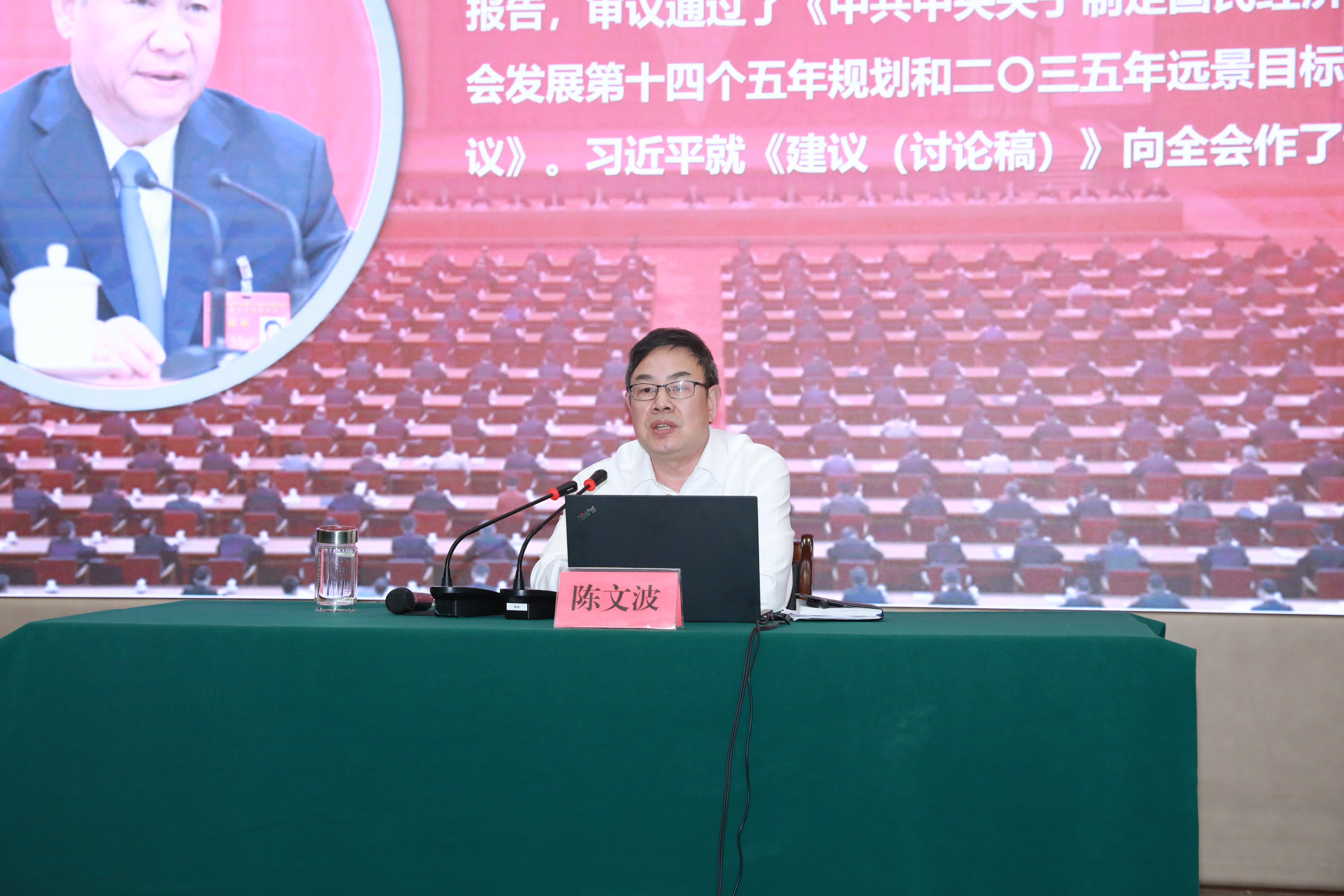 陳文波以習近平總書記在全會上提出的一系列新思想、新觀點、新論斷、新要求為切入點,對黨的十九屆五中全會精神進行了全面解讀,重點分析了“10”個決定性成就、“1”個重要判斷、“1”個指導思想、“5”項必須遵循的原則、“2”個發(fā)展目標、“12”項重點任務等主要內(nèi)容。他總結回顧了“十三五”期間取得的輝煌成就,從經(jīng)濟實力繼續(xù)增強、經(jīng)濟結構持續(xù)優(yōu)化、如期打贏脫貧攻堅戰(zhàn)、全面建成小康社會、社會基礎設施夯實、民生得到有效保障、生態(tài)環(huán)境質量總體改善、中國經(jīng)濟發(fā)展取得開創(chuàng)性成就等方面進行了詳細分析,并對“十四五”時期我國經(jīng)濟社會發(fā)展的主要目標和2035年遠景目標進行了深度理解。