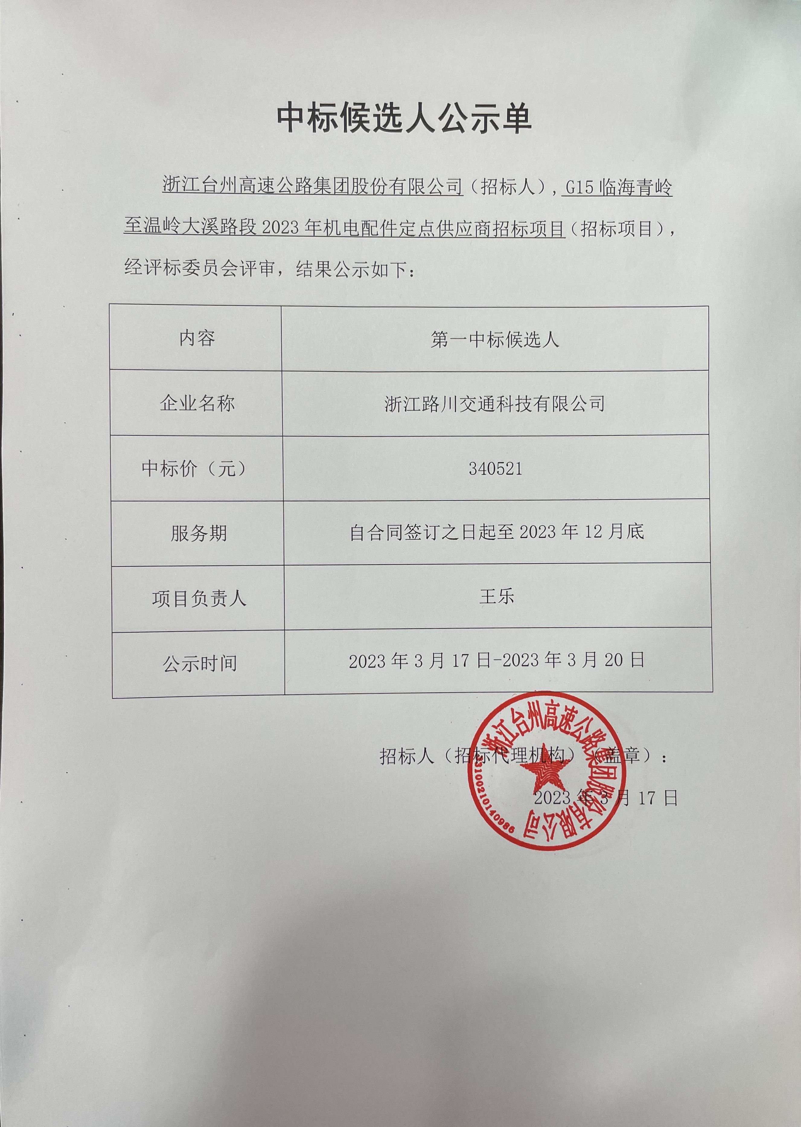 G15臨海青嶺至溫嶺大溪嶺路段2023年機(jī)電配件定點(diǎn)供應(yīng)商招標(biāo)項(xiàng)目(中標(biāo)候選人公示)