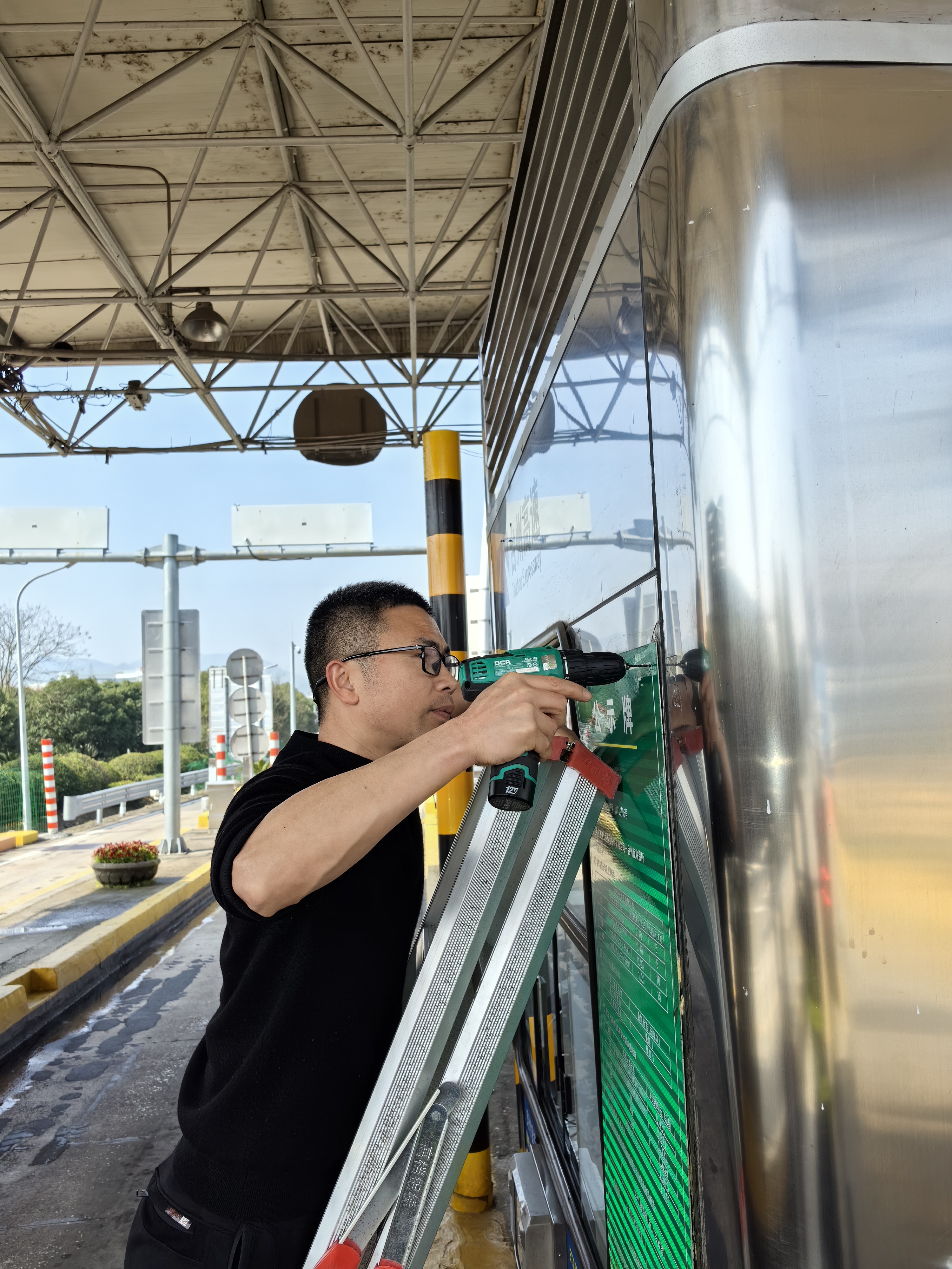 3月12日,臺(tái)州南收費(fèi)所副所長洪清源接到收費(fèi)員報(bào)告,收費(fèi)崗?fù)ね鈮Φ墓九埔蚰昃煤烷L時(shí)間日曬雨淋,背面粘合的膠水已經(jīng)風(fēng)干,邊角都翹了起來,會(huì)有脫落的可能,不僅不美觀,而且銳利的邊角容易造成劃傷,更重要的是會(huì)給司機(jī)留下不好的印象。洪所長了解情況后立即帶上工具,第一時(shí)間前往崗?fù)みM(jìn)行修復(fù)。